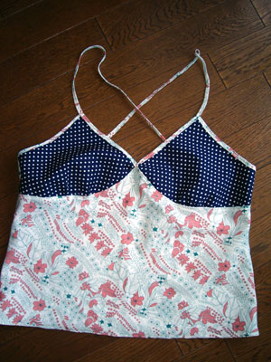 文化出版局の「キャミソール&ワンピース」の型紙で作りました。胸の紺の水玉がかわいかったのでそのまま真似しました。胸の中央がちょっとつってますが見た目ほとんと気づかれないと思う。(2005.3.13) |