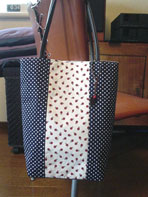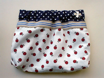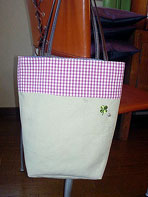| てんとう虫の生地を使ったバッグ。コパー色のクローバーのアクセサリも付けました。内側にポケットも付いています。(2005.5.7) |