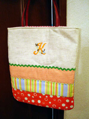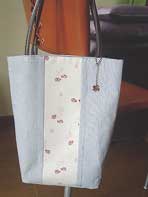 こちらもホビーショーの最新ミシン体験コーナーで。持ち手が皮のパッチワークバッグ。l体験代は材料費込みで1000円でした。義母に母の日のプレゼントとしてあげました。(2005.5.19) |