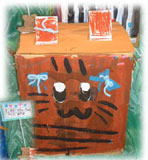 展覧会出展作品。「ねこのチューちゃん」変身マスクを作りました。工夫した点は「二つ結びをしていて片方の耳に空色の毛糸が結んであることと、しっぽを1本1本一生懸命作ったこと」だそうです。(2004.2.17) |