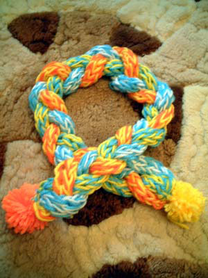 児童館で指編みマフラーを作りました。並太の毛糸2色を指編みして、3本作り、それを三つ編みにして先にポンポンをつけて完成です。やや派手な配色ではありますが、子供らしく元気が出そうなマフラーになりました。(2004.3.3) |