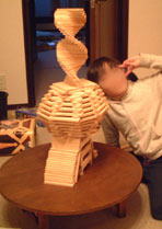 パパと久しぶりにカプラで遊びました。カプラはフランスの積み木です。下は階段のあるおうちの形から、カゴのような部分があって一番上がDNA配列を思わせるような、螺旋階段の塔が出来上がりました。これって、壊す時の音もいいんですよ〜(2004.4.5)