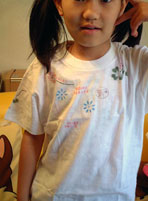 | 4月のチマ会で一緒にやった「はんど&はあと」のステンシルTシャツです。スタンプのアルファベットが小さくてよく見えませんが、ANGELとかHAPPY SMILE とか名前が押してあります。チマシープのスタンプも押して見ました。モデルさんがじっとしていなくて、何枚も写真取り直しました。クリックすると、Tシャツの裏面 もう一枚の表裏が見られます。(2004.4.21) |