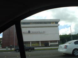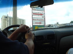 タモンからアルパンビーチタワーに向かって走り、アルパンビーチタワーが見えてくると左側に「ベンフランクリン」と書かれた大きな建物が。でもこれではありません。もともと「ベンフランクリン」が大型スーパーだった頃の建物らしいです。